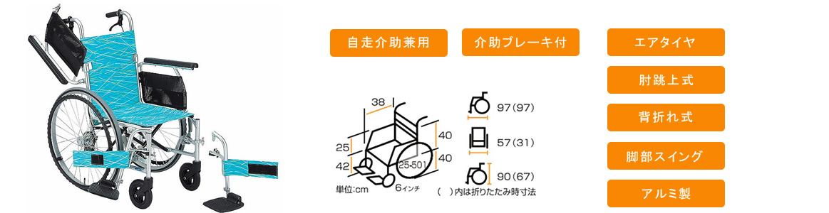 | サイズ | 幅57×奥行97×高さ90cm 重量12Kg 座幅40 前座高42cm バンド式介助用ブレーキ標準装備。 |